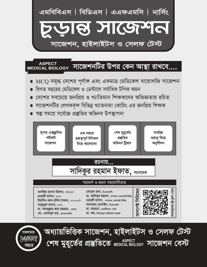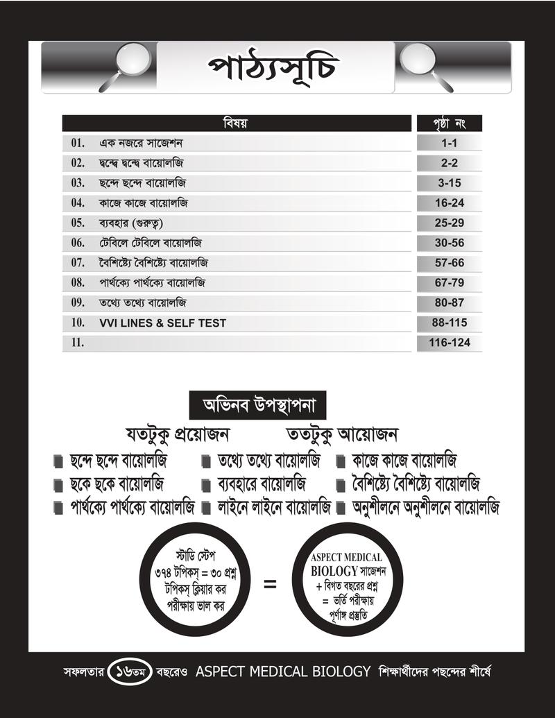 ভর্তি পরীক্ষা অতি সন্নিকটে তাই শেষ সময়ে শর্টকাট কিন্তু পূর্ণাঙ্গ প্রস্তুতির জন্য আসপেক্ট সিরিজের হাইলাইট হচ্ছে একমাত্র ভরসা । MCQ ও Written পরীক্ষার প্রস্তুতি আরো বেগবান করার জন্য আসপেক্ট হাইলাইটগুলো হবে তোমার সাফল্যের সিড়ি গড়ার কারখানা। ♥ ভর্তি পরীক্ষায় যে অংশ থেকে বেশি প্রশ্ন করা হয় সেই অংশ গুলো Topic অনুযায়ি আলোচনা করা হয়েছে ♥ সহজে প্রতিটি লাইন মনে রাখার জন্য রয়েছে Exclusive Tricks and Tips ♥ প্রতি অধ্যায় শেষে মানসম্মত প্রশ্নের মাধ্যমে নিজেকে যাচাই করার জন্য থাকছে SELF TEST ♥ Aspect Special যেখানে বইয়ের আলোচনাকে সংক্ষেপে তুলে ধরা হয়েছে ♥ গুরুত্বপূর্ণ লাইন গুলো একসাথে পড়ার জন্য সংযোজন আছে VVI Topics at A Glance ♥ সবশেষে রয়েছে Model Test যার মাধ্যমে নিজের প্রস্তুতি যাচাই করতে পারবে ভর্তি পরীক্ষা অতি সন্নিকটে তাই শেষ সময়ে শর্টকাট কিন্তু পূর্ণাঙ্গ প্রস্তুতির জন্য আসপেক্ট সিরিজের হাইলাইট হচ্ছে একমাত্র ভরসা।