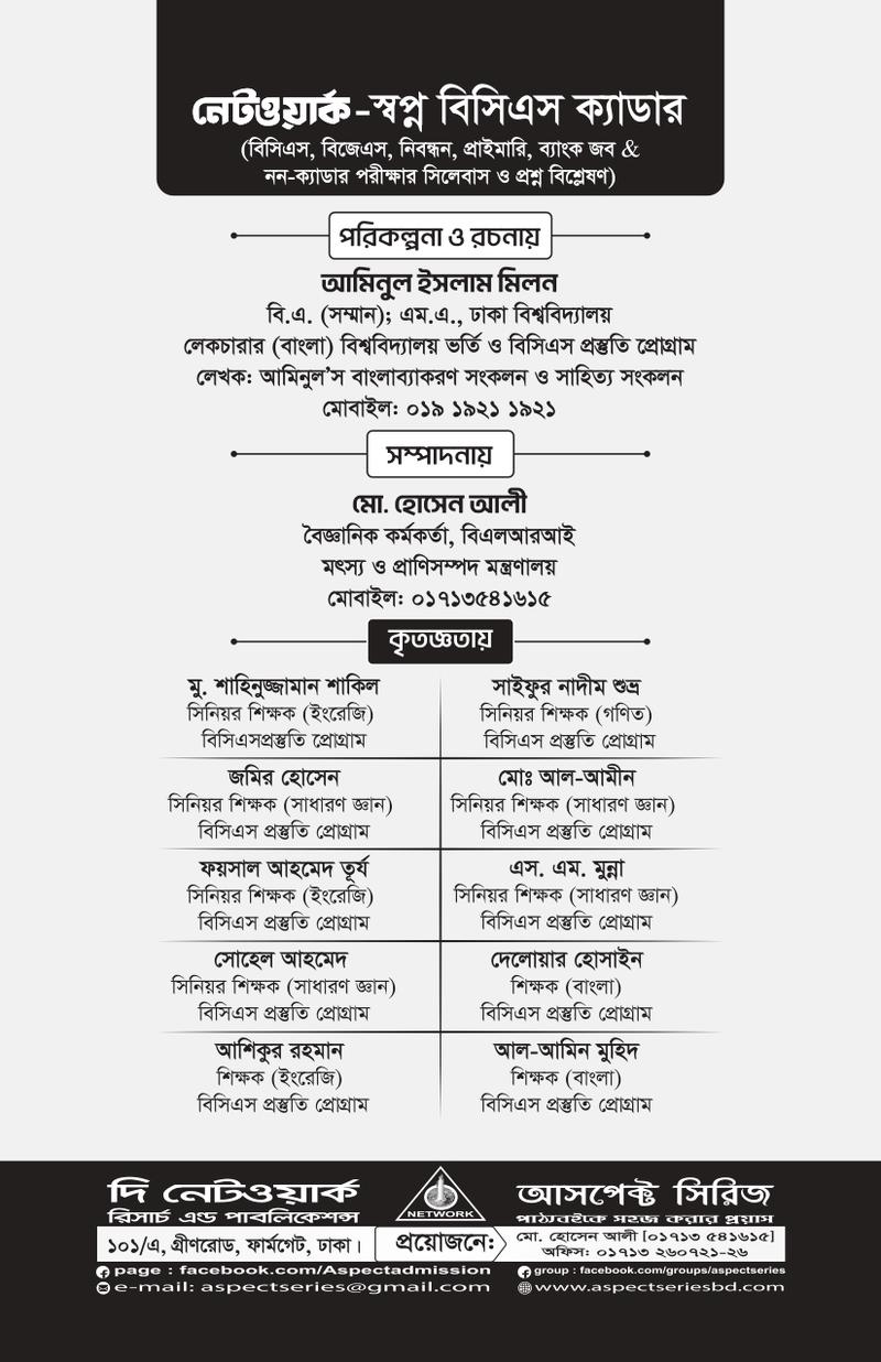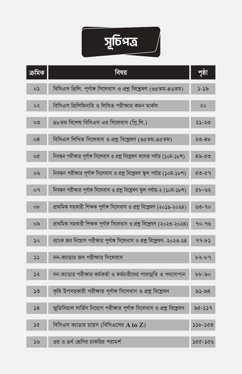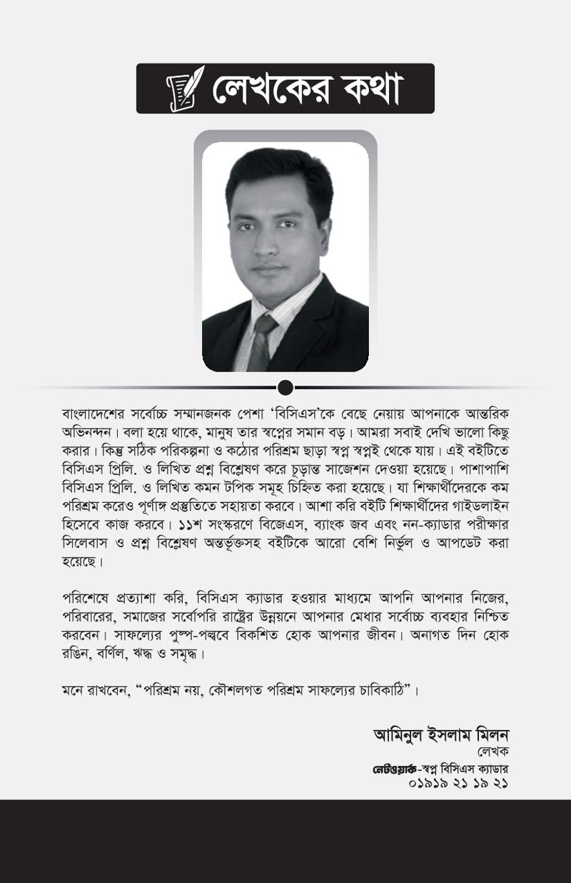 বাংলাদেশের সর্বোচ্চ সম্মানজনক পেশা 'বিসিএস'কে বেছে নেয়ায় আপনাকে আন্তরিক অভিনন্দন। বলা হয়ে থাকে, মানুষ তার স্বপ্নের সমান বড়। আমরা সবাই দেখি ভালো কিছু করার। কিন্তু সঠিক পরিকল্পনা ও কঠোর পরিশ্রম ছাড়া স্বপ্ন স্বপ্নই থেকে যায়। এই বইটিতে বিসিএস প্রিলি. ও লিখিত প্রশ্ন বিশ্লেষণ করে চূড়ান্ত সাজেশন দেওয়া হয়েছে। পাশাপাশি বিসিএস প্রিলি. ও লিখিত কমন টপিক সমূহ চিহ্নিত করা হয়েছে। যা শিক্ষার্থীদেরকে কম পরিশ্রম করেও পূর্ণাঙ্গ প্রস্তুতিতে সহায়তা করবে। আশা করি বইটি শিক্ষার্থীদের গাইডলাইন হিসেবে কাজ করবে। ১১শ সংস্করণে বিজেএস, ব্যাংক জব এবং নন-ক্যাডার পরীক্ষার সিলেবাস ও প্রশ্ন বিশ্লেষণ অন্তর্ভুক্তসহ বইটিকে আরো বেশি নির্ভুল ও আপডেট করা হয়েছে।