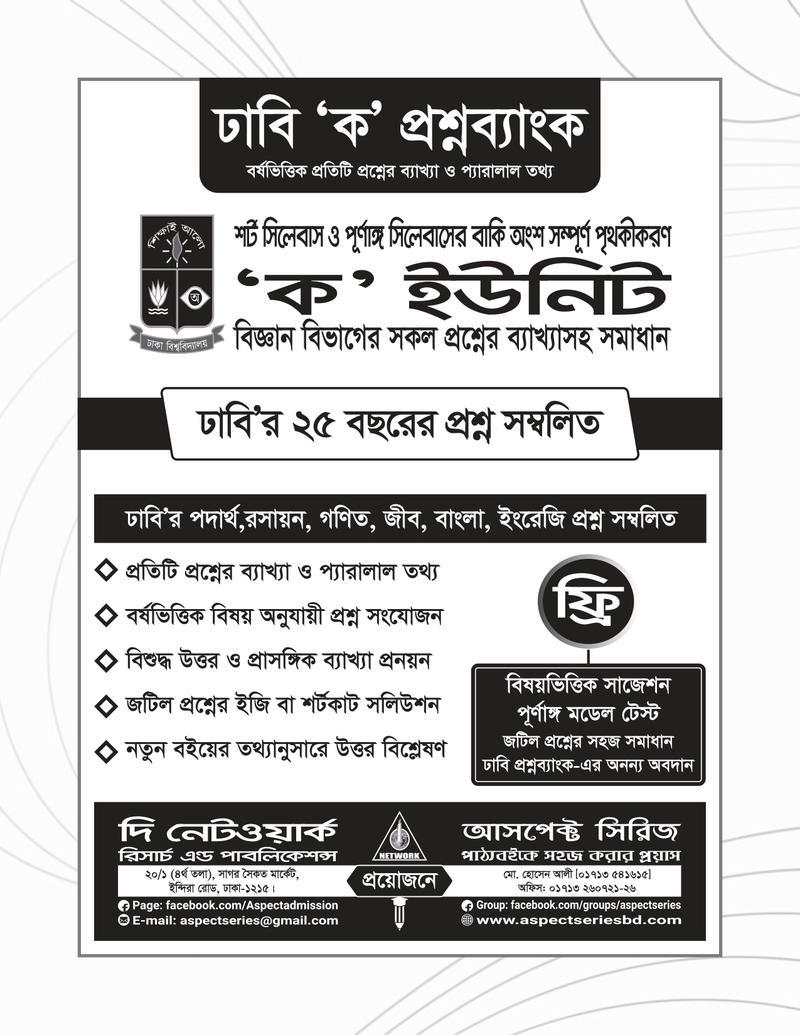 ঢাবি’র পদার্থ,রসায়ন, গণিত, জীব, বাংলা, ইংরেজি প্রশ্ন সম্বলিত