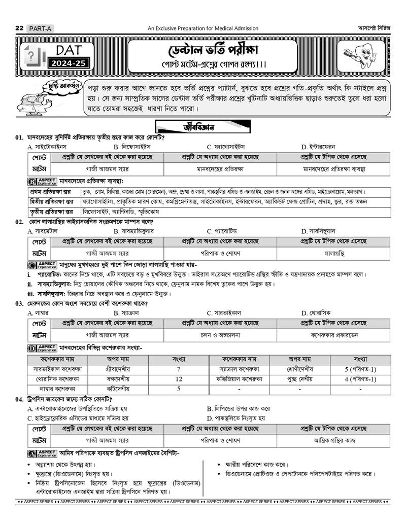 - ডেন্টাল প্রশ্নঃ বিগত ১১ সালের অধিক ডেন্টাল প্রশ্নের অধ্যায়ভিত্তিক ও টপিকস অনুযায়ী ব্যাখ্যাসহ বিশ্লেষণ